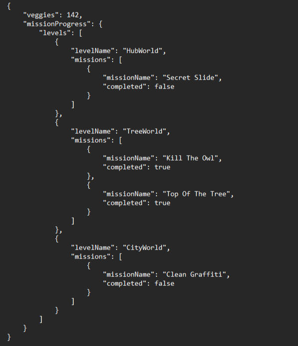 "savefile.json" tracks the number of veggies collected, and completion progress of every mission in the game.