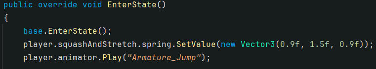 By simply setting the spring's value to a vertically stretched vector when the player jumps, the spring will automatically start trying to reach its target value (1, 1, 1 in this case), creating a satisfying "bouncy" response, eventually returning the player to their standard scale.
