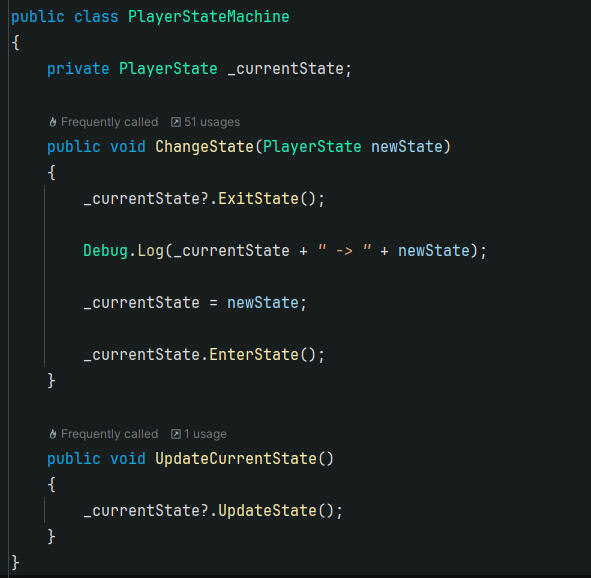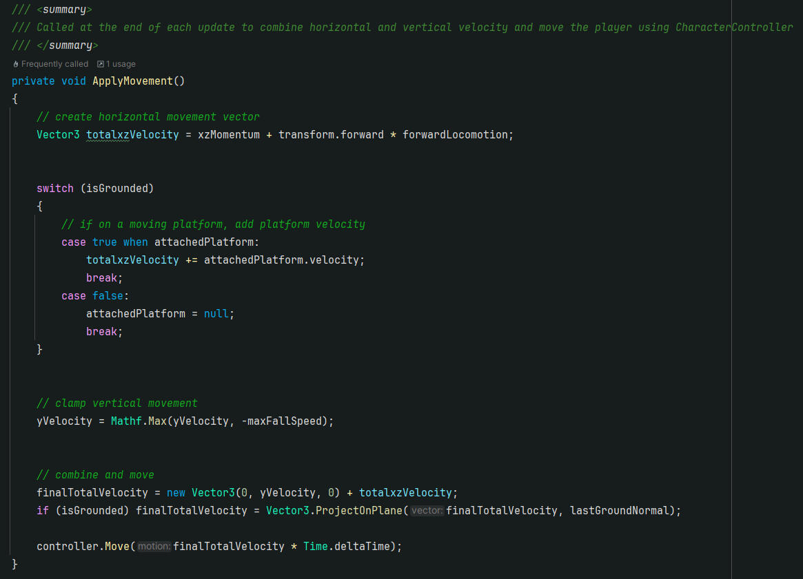 In past projects, I have usually kept all player movement logic in a single Monobehaviour class (a Unity component) attached to the player character, but this was very difficult to maintain, and always made it annoying to add new movement features. So for this project, I used a State Machine which allowed me to keep movement code in separate classes (WalkingState, JumpingState, etc) which made it way easier to add new movement techniques without breaking existing logic!