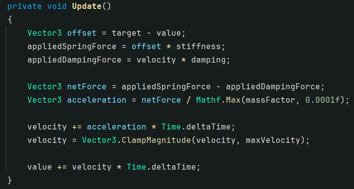 Therefore, I wrote a VectorSpring class with math based on Hooke's Law of Elasticity to easily add bouncy animation to the character through code. Essentially, each Spring component keeps track of a value (in this case, a 3D vector) and a target value, and continuously updates the current value through simulated spring-like forces based on the difference between the current value and the target value.A spring's stiffness and damping can be easily configured to achieve the right feel.