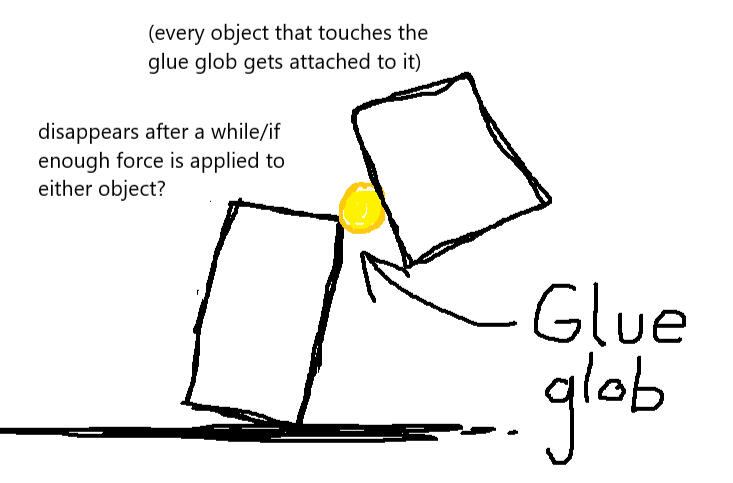 Our first draft of the glue mechanic was letting the player shoot "glue balls", which would attach to any objects it touched. The idea was that you could first shoot a glob of glue at an object, wall, or anything, and then throw another object at the glue to attach them. However, after implementing the mechanic and trying it out, we noticed several issues.